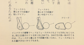 重心がフェースに近いところにあるクラブは、ロフトが死んでしまい、フェースがかぶるのと同じ結果になるわけだ。逆に中空アイアンは、重心が遠くにあるために、ボールが上がるのである。